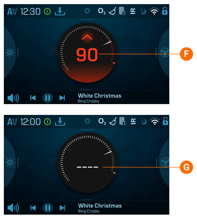2 – Il y a deux façons de modifier la température définie. Premièrement, appuyez sur les boutons plus et moins (I)(D). Deuxièmement, faites glisser l’icône de température définie (E).