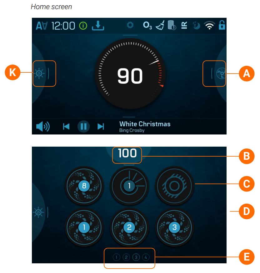 3 – Allumez/éteignez les lumières (K). Si votre spa est équipé de Chromazone™, faites glisser vers la gauche ici (K) pour afficher l’écran de Chromazone.