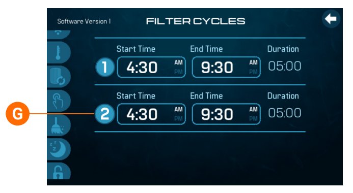 Le cycle de filtrage 2 est optionnel. Il est désactivé lorsque le bouton « 2 » est bleu foncé (K). Appuyez sur le bouton « 2 » et la couleur changera en bleu clair (G), ce qui indique que le cycle de filtrage 2 est activé.