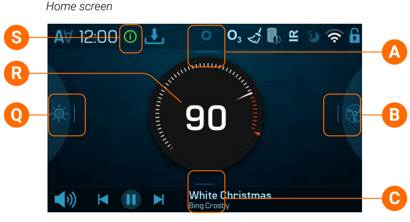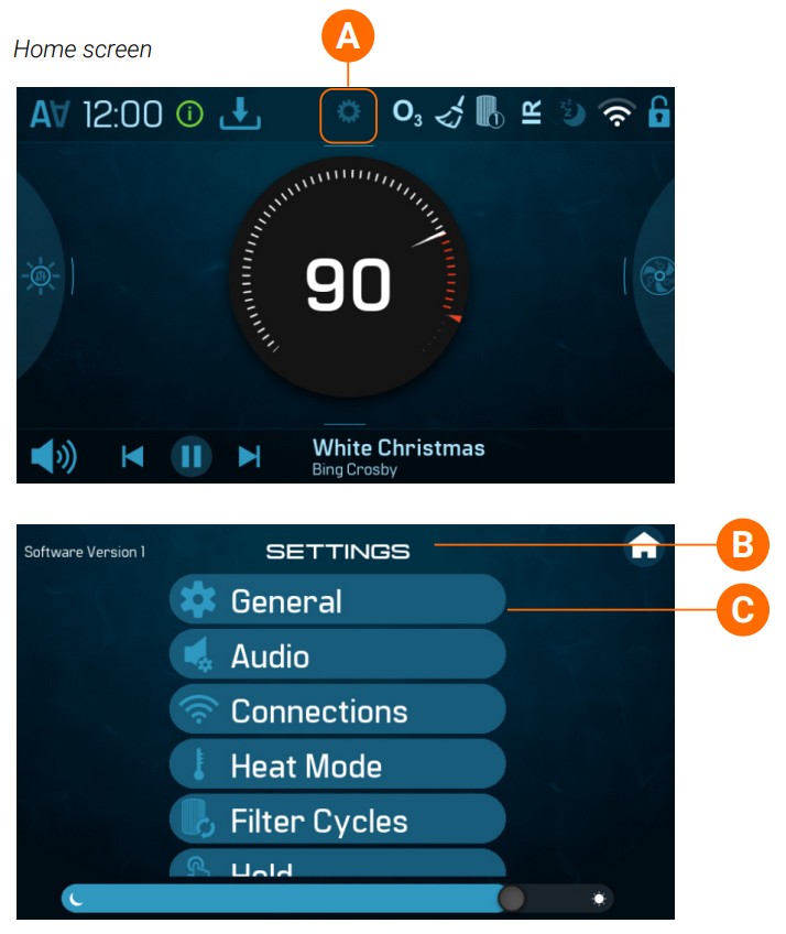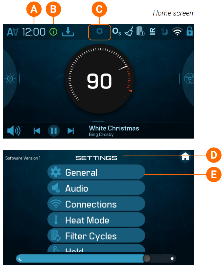 1 – Faites glisser vers la droite ici (A) pour afficher l’écran du spa (D).