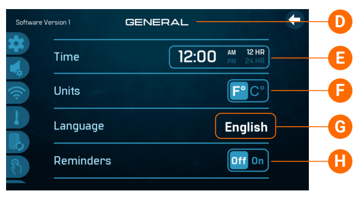 2 – Appuyez sur Général (C) pour afficher l’écran Général (D).