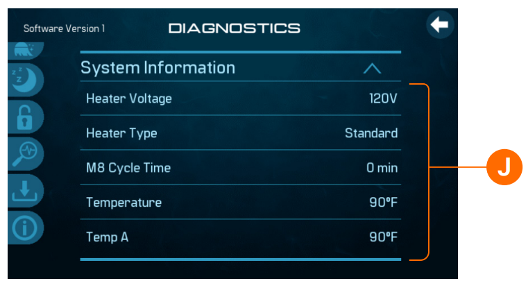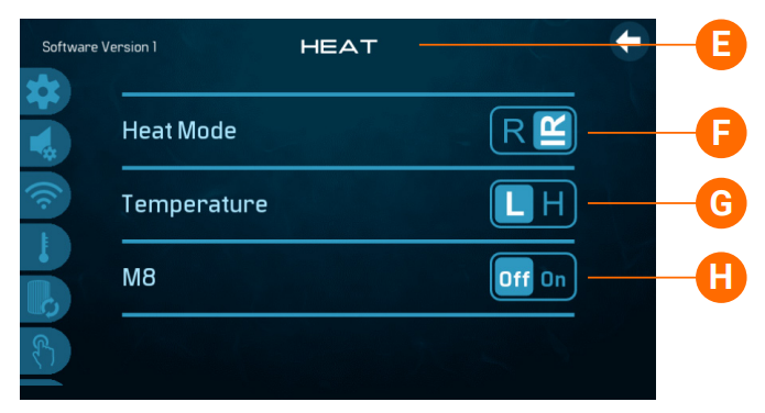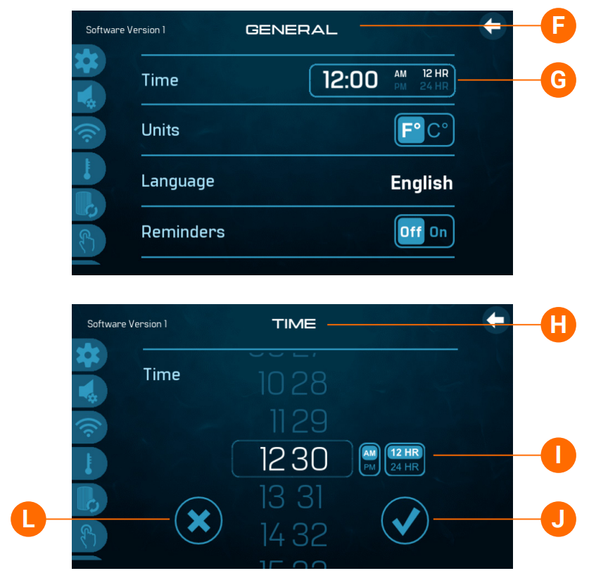 1 – Appuyez sur l’affichage de la température de l’eau (K) pour afficher l’écran de température (C). Voici la température de l’eau (J), et voici la température définie (H).