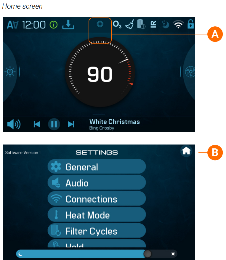 B – Faites glisser vers la droite ici pour afficher l’écran des dispositifs du spa.