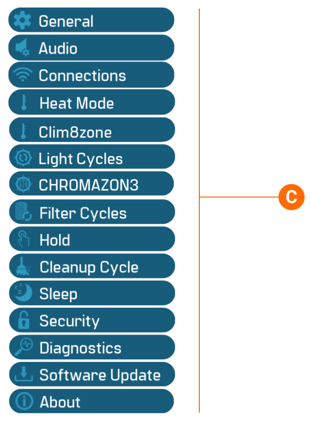 1 – Faites glisser vers le bas ici (A) pour accéder aux paramètres (C). Appuyez sur Cycles de Filtrage (D) pour afficher l’écran des Cycles de Filtrage (E).